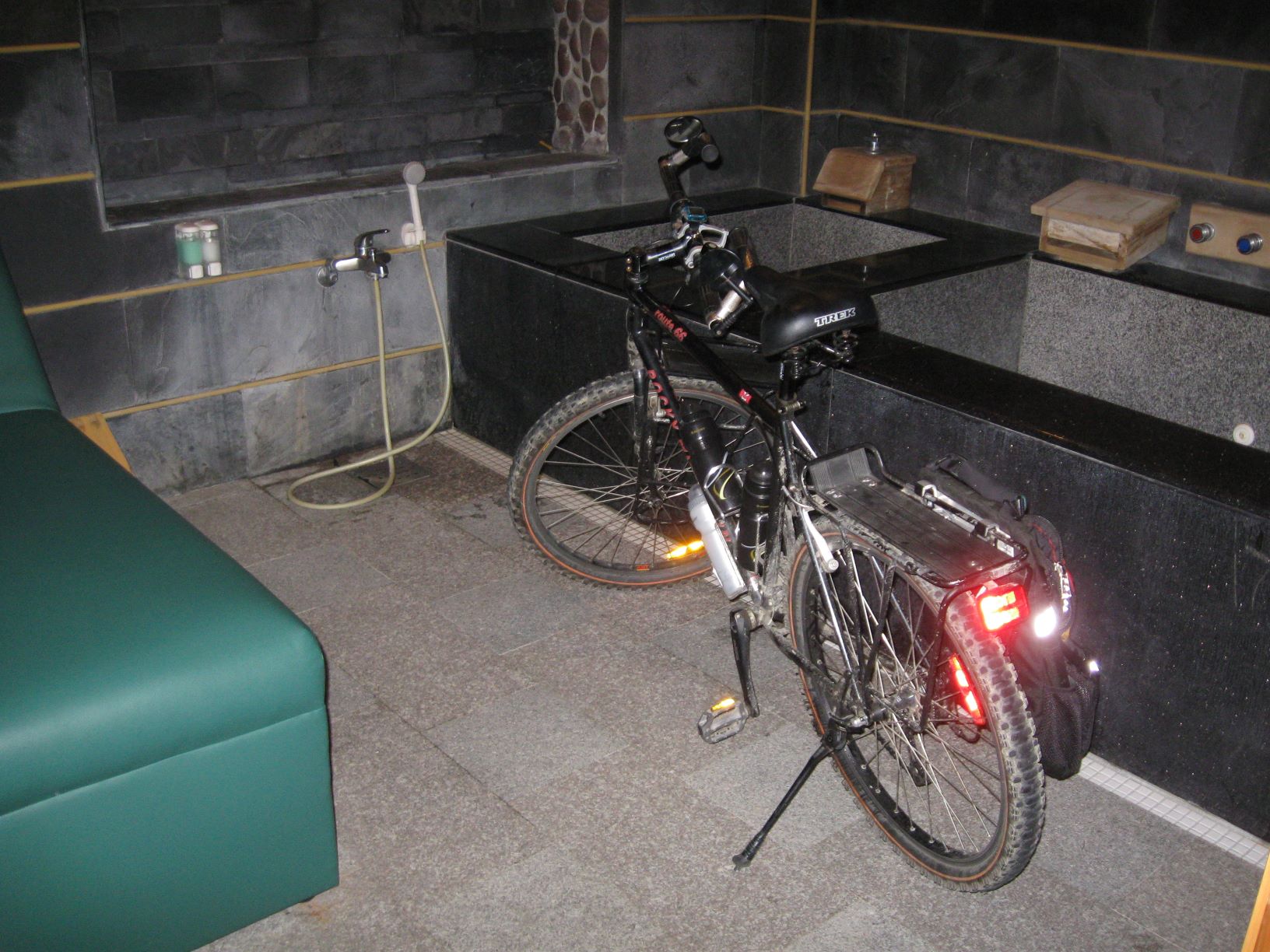 I do like the funky aspects though. For one thing, it has double elevators! The hotel rises up for five or six floors in a strange way – it isn’t just a square block, but a jumble of towers and glass structures. One elevator starts far below in an alley and only goes up one floor. Then you leave that elevator and find yourself at the main entrance where there is another elevator to take you the rest of the way. These elevators are encased in glass tubes, so you can see around you as you go up. It’s also handy for me, because I can take my bicycle up in the elevators all the way from street level. My room is actually a bit small to contain my bicycle, but the guy who brought me to my room, opened up a separate spa room and said that I could leave my bicycle there. Where else but in Taiwan would you get an entire spa room for your bicycle?