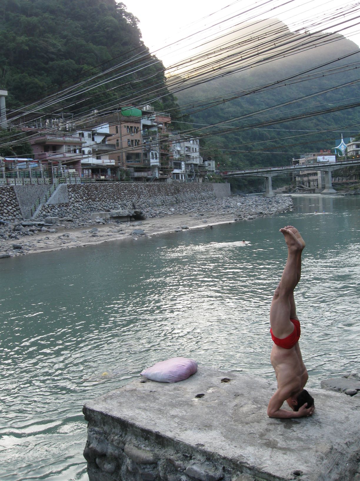I don’t imagine that I will stay in Wulai very long today. I was up before dawn again and walking around the river and the town in the cool of the pre-dawn light. I returned to the hot spring area where dozens of the senior citizens were already doing all those crazy things that they do. I think I could return there every morning for a month and still be amazed at that scene. This morning, I was entertained by a Mr. Atlas type, who made it his business to do a very long headstand on a slab of concrete jutting out into the river. It was easy to find the scene amusing, but it was also impressive. I couldn’t have done a headstand like that when I was in my teens let alone now. I also felt a smile play around my lips when I saw this older woman doing some stretching exercises at this bizarre homemade exercise apparatus. The apparatus and the contortions into which she threw her body were right out of the Spanish inquisition. It looked torturous not to mention silly. Who would do such a thing to themselves at 6:30 in the morning when they could be lying comfortably in bed (or scalding themselves in a tub of hot water)? Yet, I couldn’t help but reflect that of all the senior citizens I hung out with in Sarnia when I was back in Canada, not a one could have come even close to bending over like that. In fact, I don’t think many of them would have dared risk the stairs from the street down to the riverside.