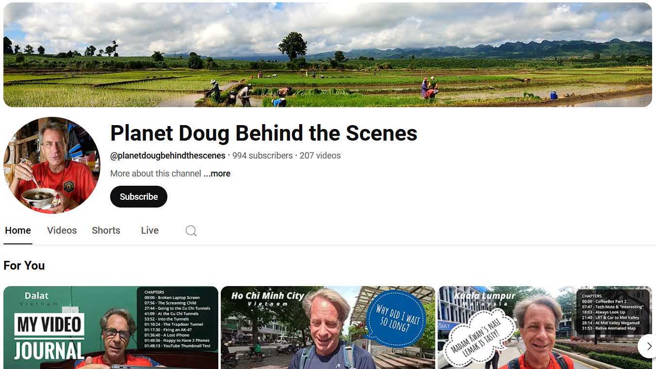 When I noticed this trend long ago, I started splintering my YouTube life. I started creating new YouTube channels. I created a Planet Doug Behind the Scenes channel. My idea was to record video journals of my life. And I thought I could also post all the extra bonus clips and other items. It would be like a dumping ground for anything I wanted to create and post. And nobody could be disappointed or upset with me, because this was all behind-the-scenes. It was my video playground to do with whatever I wanted. There would be no expectations about what would be there. I also created a technology channel. If I ever wanted to talk about camera gear, I could make the video and post it to this channel instead of to Planet Doug. That way, I would avoid upsetting people if I started babbling about the features of newest action camera. I also created a completely new channel just for 360 videos.
