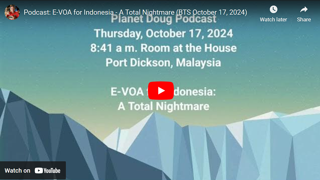 Podcast: E-VOA for Indonesia – a Total Nightmare October 17, 2024July 16, 2025 Thursday, October 17, 20248:41 a.m. My Room at the HousePort Dickson, Malaysia Planet Doug Podcast - 2024