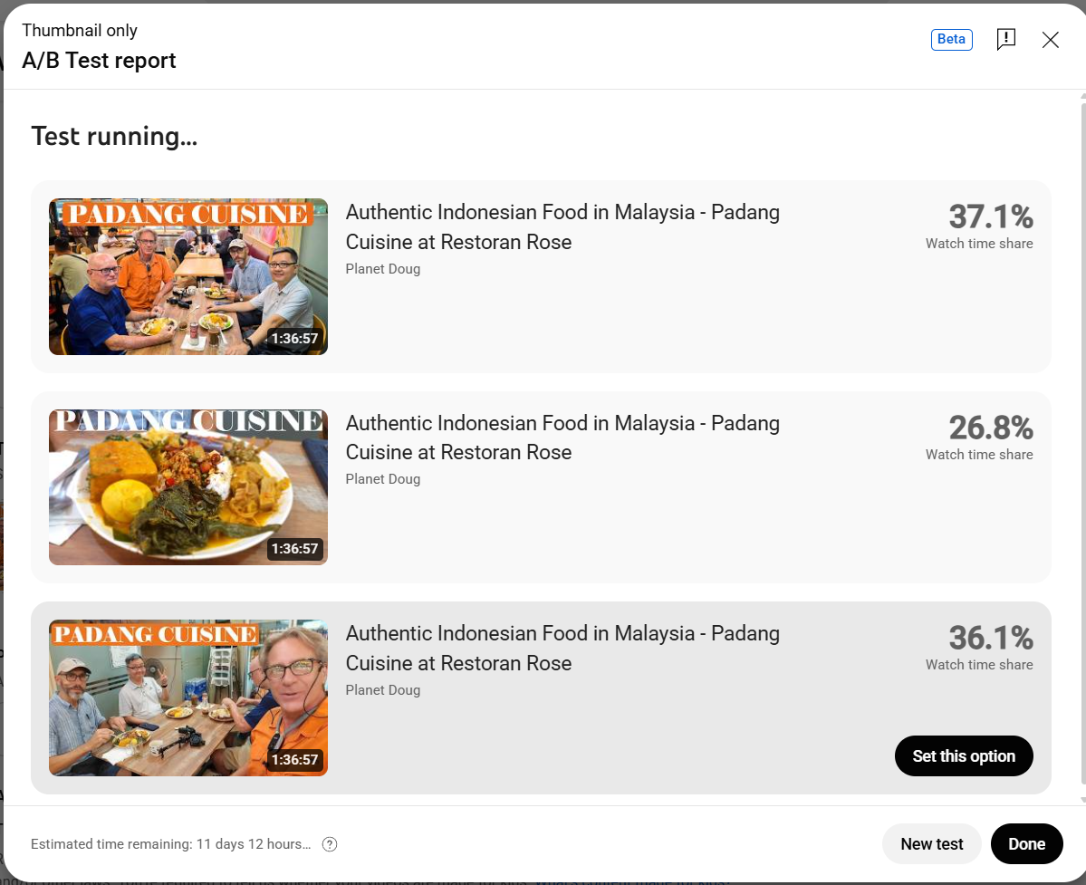 Two of the thumbnails feature pictures of me and the people I had brunch with. But the other thumbnail is simply a picture of a plate of Indonesian food. And that food thumbnail scored 26.8% while the thumbnails with pictures of people scored 36% and 37%. It’s not a huge difference, but it does indicate that people prefer thumbnails with people in them.